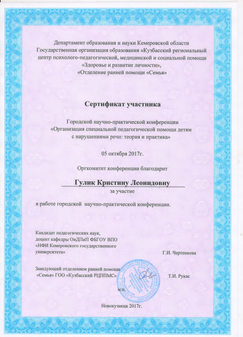 Квалификация: воспитатель детей дошкольного возраста с отклонениями в речевом развитии.